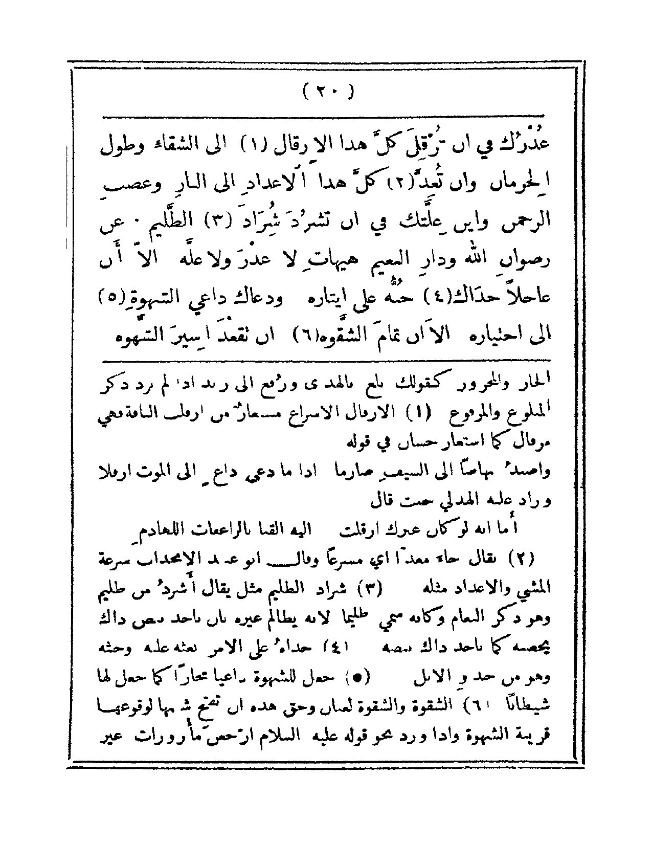 عُذركَ في أنْ ترقلَ كلَّ هذا الإرقالِ إلى الشقاءِ وطولِ الحرمانْ. وأنْ تغذَّ كلَّ هذا الإغذاذِ إلى النارِ وغضبِ الرحمنْ. وأينَ علتكَ في أن تشرُدَ شرادَ الظليمْ. عن رضوانِ الله ودارِ النعيمْ. هيهاتَ لا عذرَ ولا علّة إلا أنَّ عاجلاً حَداك حبُّه على إيثارهْ. ودعاكَ داعي الشهوةِ إلى اختيارهِ. ألا إنَّ تمامَ الشقْوةْ أن تقعُد أسيرَ الشهوةْ.