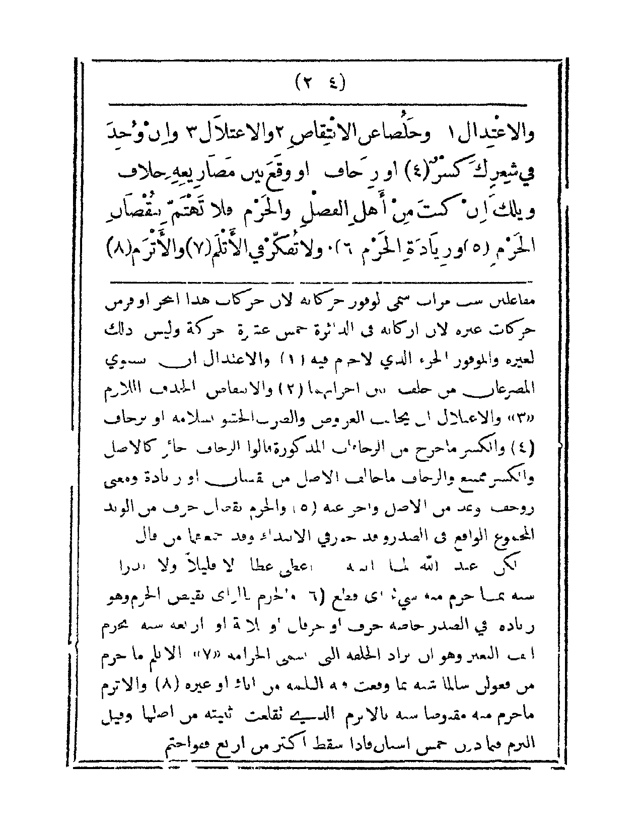 والاعتدَالْ وَخَلصَا عن الانتقَاصِ والاعتِلالْ. وَإنْ وُجِدَ في شِعْرِكَ كَسْرٌ أوْ زِحَافْ. أوْ وَقَعَ بَينَ مَصَارِيِعِهِ خِلافْ. وَيْلَك إنْ كُنْتَ منْ اهلِ الفضْلِ والحزْمْ. فلا تهْتَمَّ بنُقْصانِ الخرْمِ وزيادةِ الخَزْمْ، وَلا تُفكِّرْ في الأثْلَمِ والأثْرَمْ،
