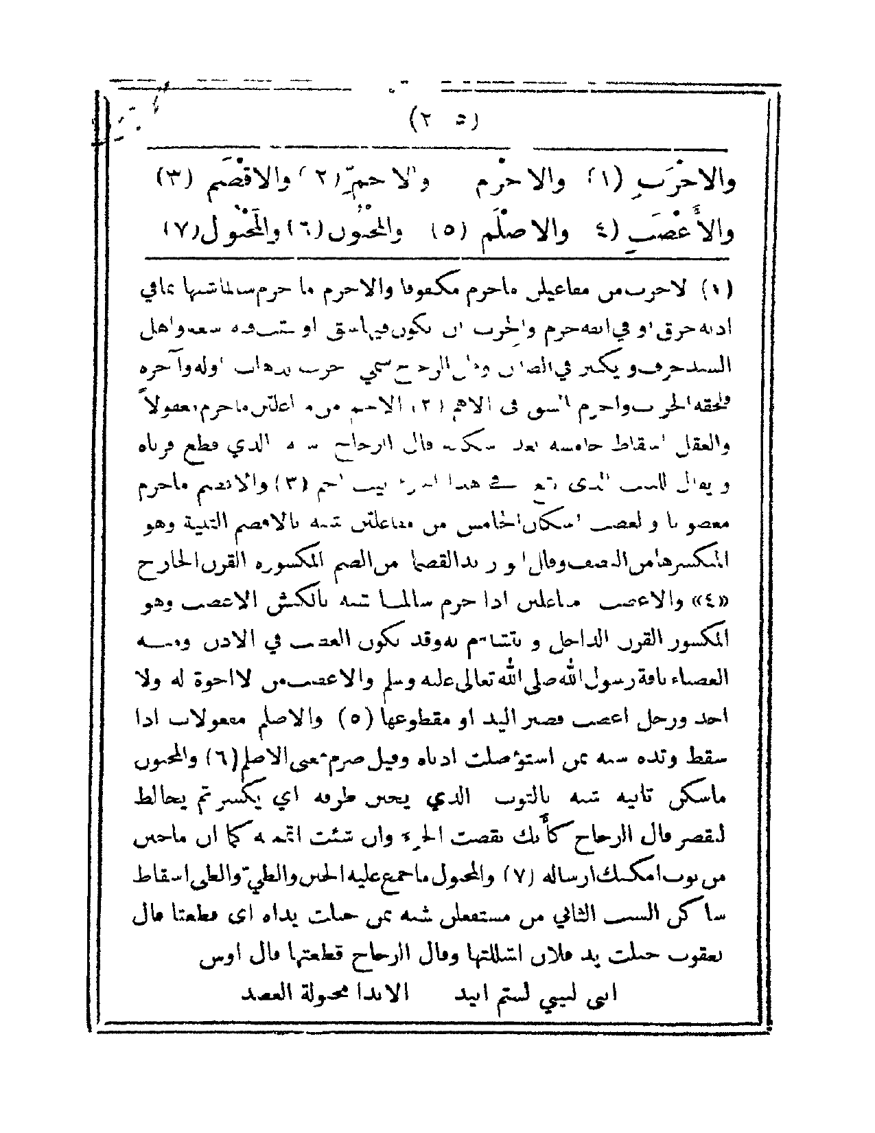 والأخْرَب، والأخْرَمْ، والأجمَ، ِّ والأقْصَمْ، والأعْضَبِ، والأصْلَمْ، والمخْبُونِ، والمخُبولْ،