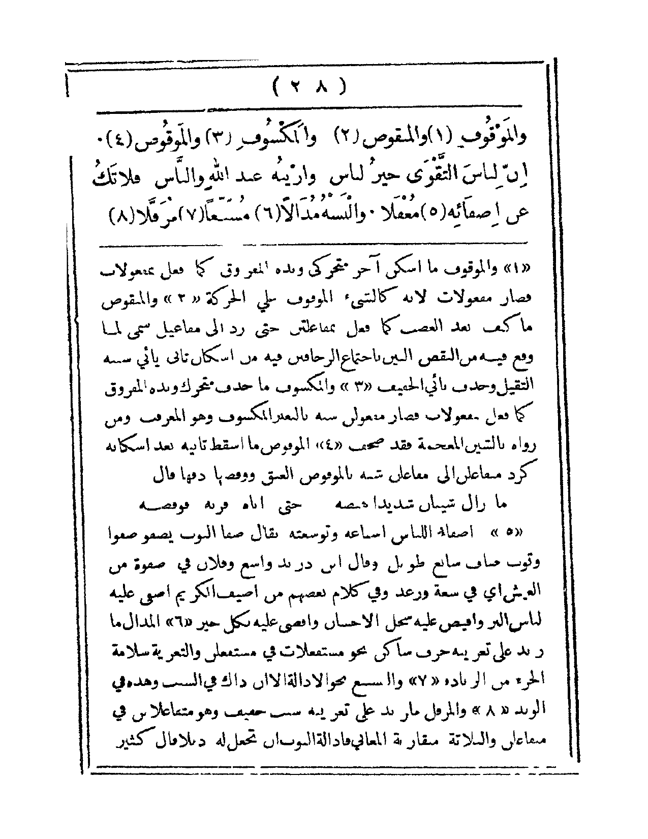 والموْقُوفِ، والمنقُوصْ، والمكسُوفِ، والموقُوصْ. إنَّ لِبَاسَ التّقْوَى خَيْرُ لِبَاسْ، وأزْيَنُهُ عندَ اللهِ والنّاسْ فلا تَكُ عَنْ اضْفائِهِ مُغْفَلاً، وَالبْسَهُ مُذالاً مُسَبّغاً مُرَفّلاً.
