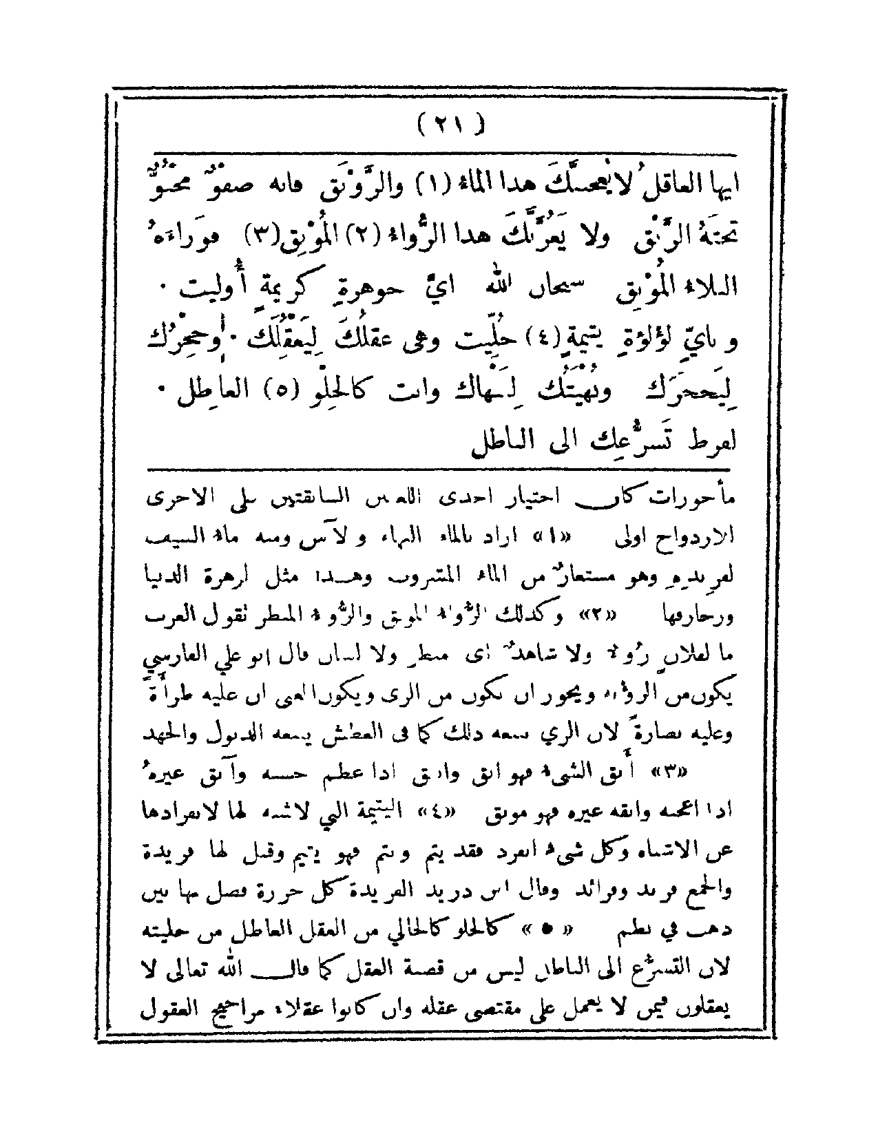 أيها العاقل ُلا يعجبنّك هذا الماءُ والرَّونقْ. فإنهُ صفوٌ مخبوٌ تحتهُ الرَّنق. ولا يغرَّنكَ هذا الرواءُ المونق. فوراءهُ البلاءُ الموبقْ. سبحانَ الله. أيَّ جوهرةٍ كريمةٍ أوليتْ. وبأيّ لؤلؤةٍ يتيمةٍ حليّتْ. وهي عقلكَ ليَعقلك. وحجُركْ ليحجرك. ونهيُتك لتنهاكَ وأنتَ كالخلو العاطلْ. لفرط تسرعكَ إلى الباطلْ.