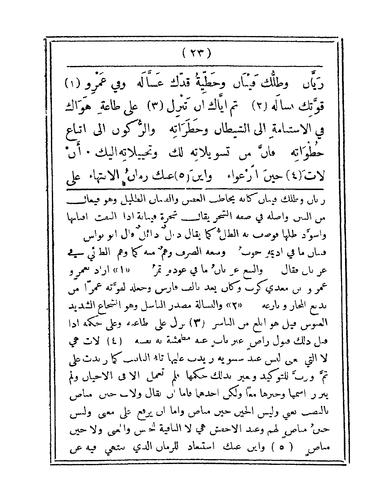ريّانْ. وظِلكَ فينانْ. وخطية قدّكَ عسّالة. وفي عمرو قوَّتكَ بسالةْ. ثمَّ إياكَ أن تنزلَ على طاعةِ هواكَ في الاستنامةِ إلى الشيطانِ وخطراتهِ. والرُّكونِ إلى اتباعِ خطواتهِ. فإنَّ منْ تسويلاتهِ لك. وتخييلاته إليك. أنْ لاتَ حين ارعواءْ. وأينَ عنكَ زمانُ الانتهاء. على