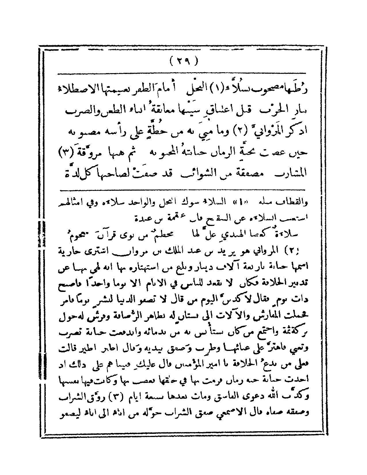 رُطبها مصحوبٌ بسلاّء النّخلِ. أمامَ الظفرِ بغنيمتها الاصطلاءُ بنارِ الحرْب. قبلَ اعتناقِ سيبِها معانقةُ أبناءِ الطعنِ والضرْب. اذكرِ المرْواني وما مُني به من خطّةٍ على رأسهِ مصبوبهْ، حين َغُصّتْ بحبةِ الرمّان حُبابتهُ المحبوبةُ. ثمَّ هَبها مُروَّقة المشاربْ. مصفّقةً من الشوائبِ. قدْ صفتْ لصاحبِها كلُّ لذَّة.