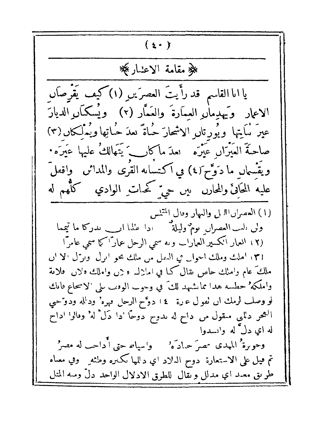 يا أبا القاسم قد رأيتَ العصرَينِ كيفَ يقرضانِ الأعمارْ. ويهدمانِ العمارةَ والعمّار. ويُسكنان الديارَ غيرَ بُناتها. ويورثانِ الأشجارَ جنُاةً بعدَ جنُاتها. ويُملكانِ صاحبةَ الغيرَانِ غيرَهْ بعدما كانَ ينهالكُ عليها غيرَهْ. ويقسمانِ ما دَوَّخ في اكتسابهِ القرى والمدائنْ. وأقفلَ عليهِ المخابئَ والمخازنْ. بينَ حي كحيّاتِ الوادي. كلُّهم لهُ