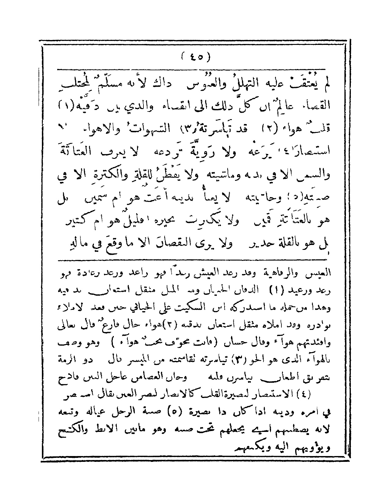 لمْ يعتقَبْ عليهِ التهلُّلُ والعُبوسْ. ذاكَ لأنهُ مسلِّمٌ لمجتلبِ القضا عالمٌ أنَّ كل ذلكَ إلى انقِضا. والذي بينَ دفّيه قلبٌ هَواءْ قد تياسرتَهُ الشهواتُ والأهواءٌ. لا استبصارَ يزَعهُ. ولا رويةَ تردَعُهْ. لا يعرِفُ الغناثةَ والسِّمنَ إلا في بدنهِ وماشيتهِ. ولا يفطنُ للقلةِ والكثرةِ إلا في ضبنتهِ وحاشيتهْ. لا يعبأ بدينهِ أغَثٌ هوَ أم سمينٌ. بل هوَ بالغثاثةِ قمينْ. ولا يكترِثُ بخيرهِ أقليلٌ هو أمْ كثيرْ. بل هوَ بالقّلةِ جديرْ. ولا يرى النقصانَ إلا ما وقعَ في مالهِ