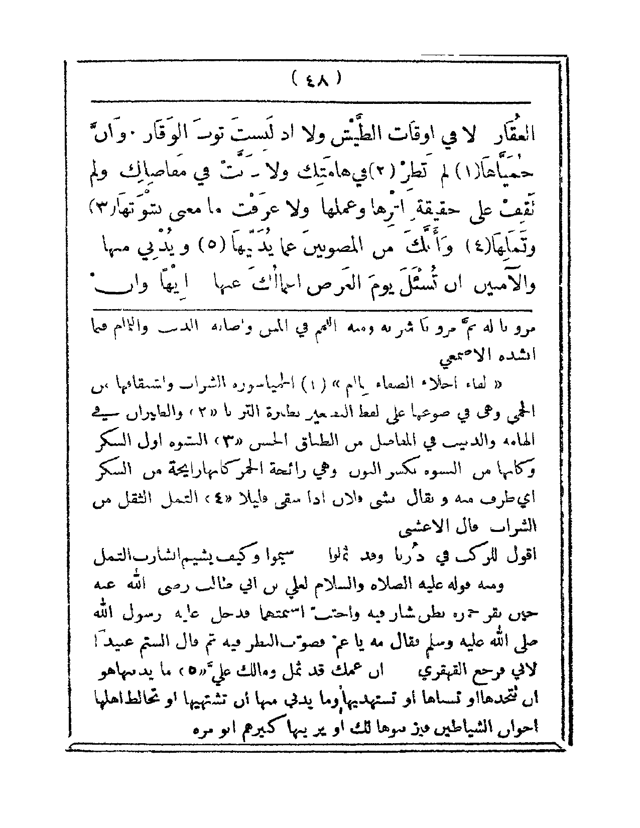 العُقار لا في أوقاتِ الطّيشِ ولا إذ لبستَ ثوبَ الوَقار. وإنَّ حُمَيّاها لمْ تطرِ في هامتكِ. ولا دبّتْ في مفاصلِكِ. ولم تقفْ على حقيقةِ أثرِها وعملِها. ولا عرفْتَ ما معنى نشوتَهِا وثملِها. وأنّكَ منَ المصونينَ عمّا يُدنُّيها ويُدْني منها. والآمنينَ أنْ تُسألُ يومَ العرضِ أعمالُكَ عنها. إيهاً وإن