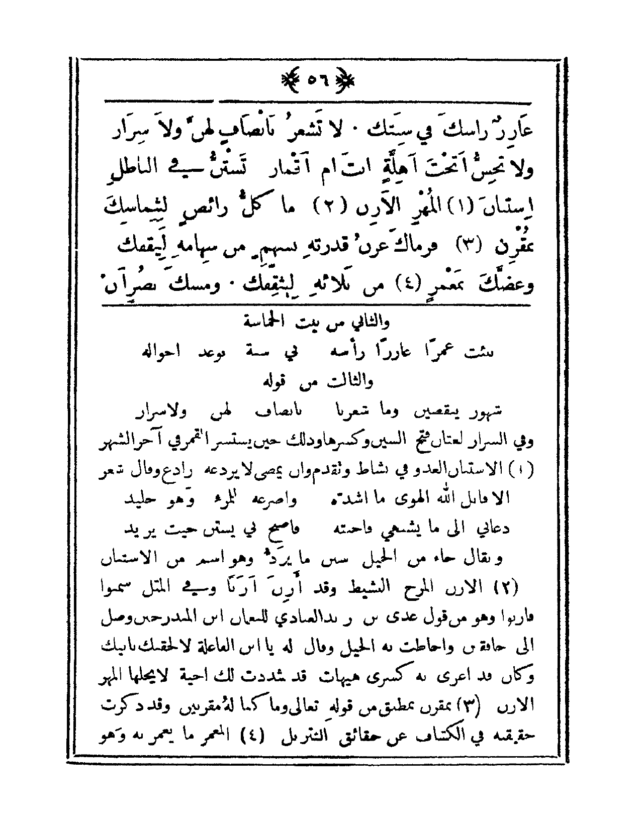 غارِزٌ رأسكَ في سِنتكْ. لا تشعرُ بإنصافٍ لهنَّ ولا سرار، ولا تحس أتحتَ أهِلّةٍ أنتَ أمْ أقمار. تستن في الباطلِ استنان المُهرِ الأرِن ما كل رائضٍ لشماسِكَ بمقرِنْ. فرماكَ عرَنُ قدرتهِ بسهمٍ منْ سهامهِ ليقفَك وعضَّكَ بمغمزٍ من بلائهِ ليثقّفك ومسّكَ بضُرٍ أن