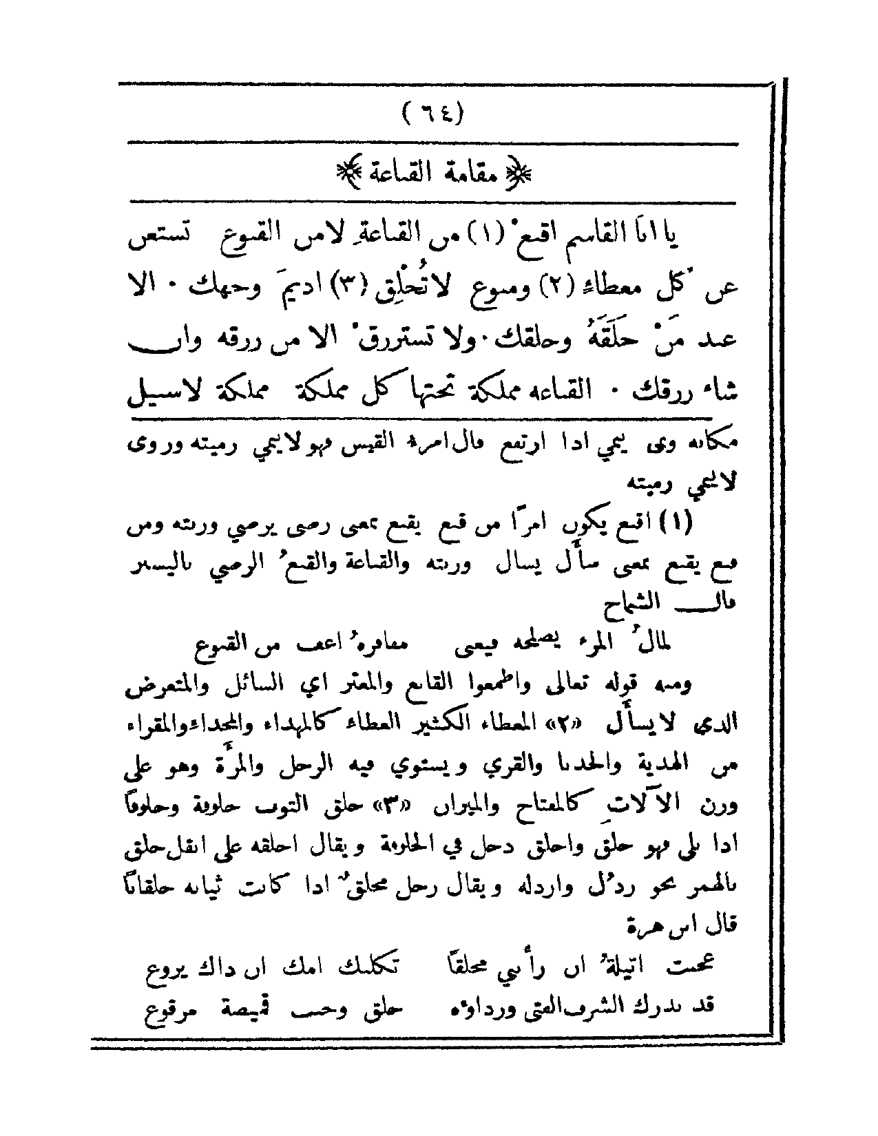 يا أبا القاسم اقنعْ من القناعةِ لا من القنوع. تستغنِ عن كلِّ مِعطاءٍ ومنوعْ. لا تخلق أديمَ وجهِكَ إلا عندَ مَن خلقهُ وخلقَك. ولا تسترزق إلا مَن رزقهُ وإن شاءَ رزَقَك. القناعةُ مملكةٌ تحتَها كل مملكة. مملكةٌ لا سبيلَ
