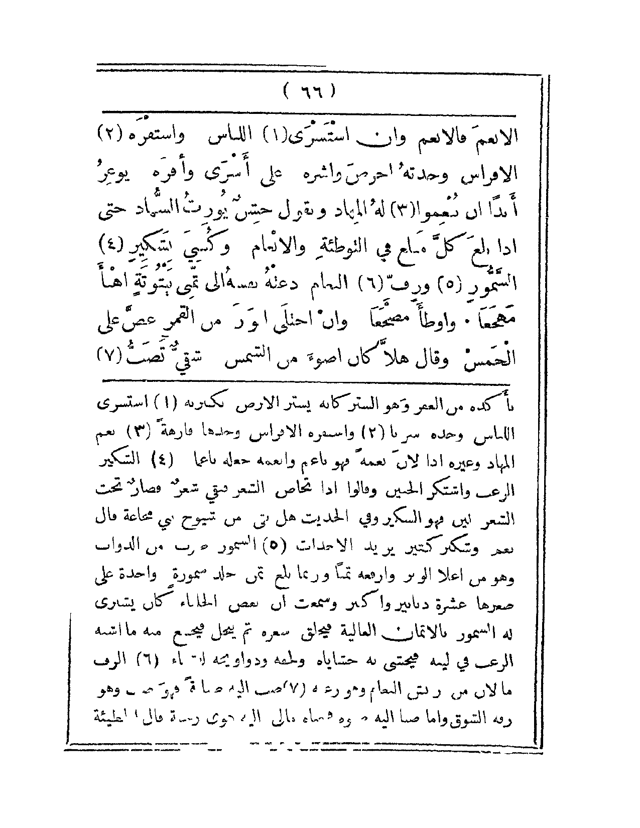 الأنعمَ فالأنعم وإن استسرى اللَّباس واستفرَهَ الأفراسْ. وجدتهُ أحرَصَ وأشرَهْ. على أسرى وأفره. يوغرُ أبداً أن يُنعموا لهُ المهاد. ويقولُ خشنٌ يورثُ السهاد. حتى إذا بلغَ كلَّ مبلغٍ في التوطئةِ والإنعامْ وكُسيَ بشكيرِ السمور وزِفِ النّعام. دعتهُ نفسهُ إلى تمنّي بيوتةٍ أهنأ مهجَعاً. وأوطأ مضجَعاً. وإنِ اجتلى أنَورَ من القمرِ عضَّ على الخمس. وقال هلا كانَ أضوءَ من الشّمس. شقيٌ تصَبُّ