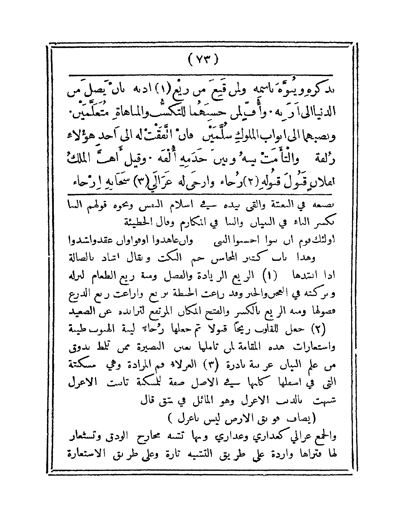 بذكرِهِ وينوَّهَ باسمه. ولمن قنعَ من ريعِ أدبه بأن يصلَ من الدنيا إلى أربه وأفٍ لمنْ حسبَهُما للتّكسبِ والمُباهاةِ متعلّمَينْ. ونصَبَهُما إلى أبوابِ الملوكِ سُلّمَينْ. فإن اتّفقتْ لهُ إلى أحدِ هؤلاءِ زُلفة. والتأمَتْ بينهُ وبينَ خدمهِ ألفه. وقيلَ أهَبَّ المَلكُ لفُلان قبولَ قبولهِ رُخاءْ وأرّخى لهُ عَزَالى سحابهِ إرْخاء.
