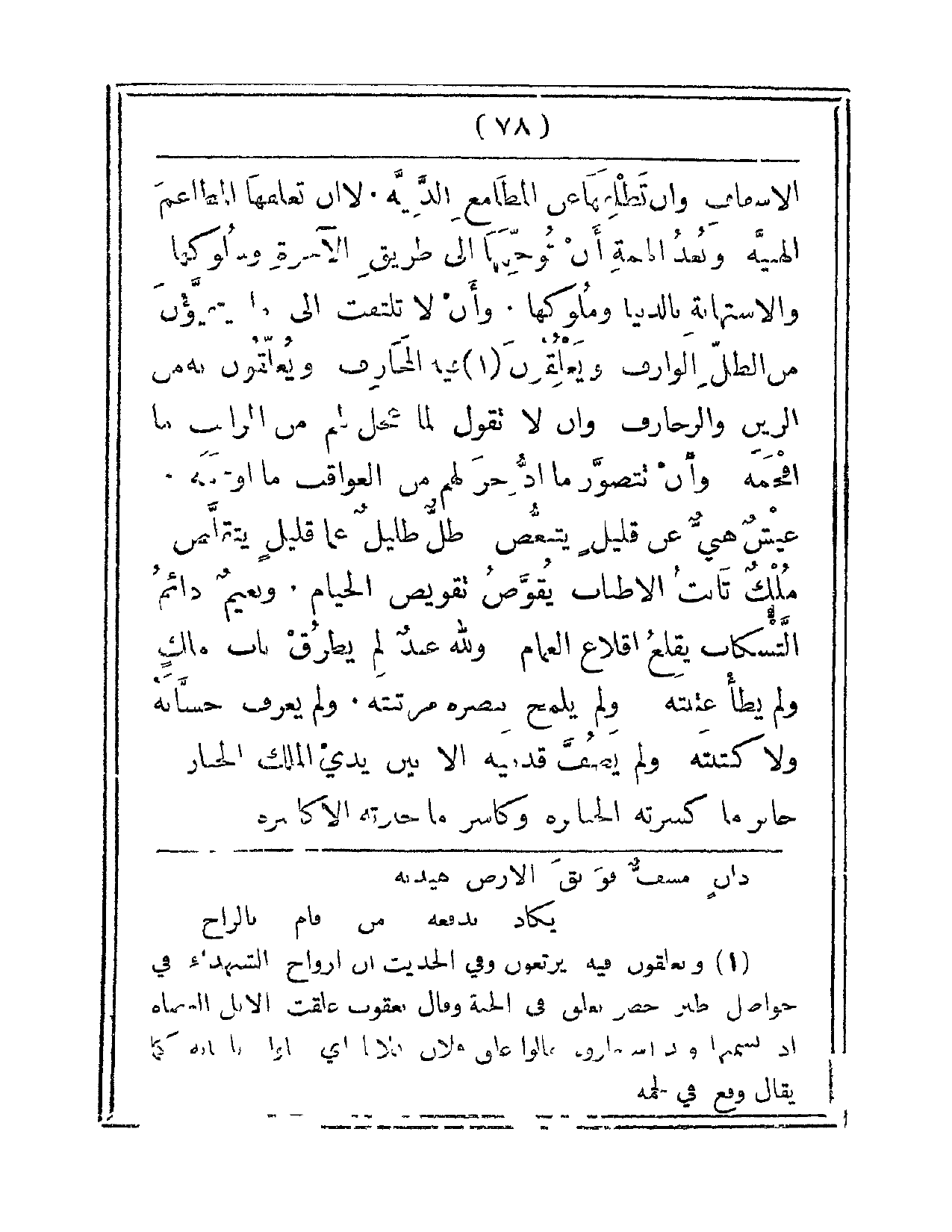 الإسفاف. وأن تظلِفَها عنِ المطامعِ الدَّنية. لا أن تعلفها المطاعمَ الهنيّة وبُعدُ الهمّةِ أن توجِّهها إلى طريقِ الآخرةِ وسلوكها. والاستهانةِ بالدنيا ومُلوكها. وأن لا تلتفتَ إلى ما يتفيئّونَ منَ الظل الوارِف. ويعلقُونَ فيهِ المخارِف. ويعلّقونَ بهِ منَ الزَّينِ والزخارف وأن لا تقولَ لما عُجَّلَ لهمْ منَ المراتبِ ما أفخمهْ وأن تتصوَّرَ ما ادخرَ لهمْ منَ العواقبِ ما أوخمه عيشٌ هنيٌ عن قليلٍ يتنغّص. ظلٌ ظليلٌ عمّا قليلٍ يتقلّص. ملكٌ ثابتُ الأطنابِ يُقوَّض تقويضَ الخيامِ. ونعيمٌ دائمُ التسكابِ يُقلعُ إقلاعَ الغَمام. وللهِ عبدٌ لم يطرُق بابَ ملكٍ ولم يطأ عتبتَهْ. ولم يلمحْ ببصرهِ مرتبتَه. ولم يعرِفْ حُسّابَهُ ولا كتَبَتَه. ولمْ يصُفَّ قدميهِ إلا بينَ يدي الملكِ الجبارِ جابرِ ما كسرتهُ الجبابرةَ. وكاسرِ ما جبرتهُ الأكاسرة.