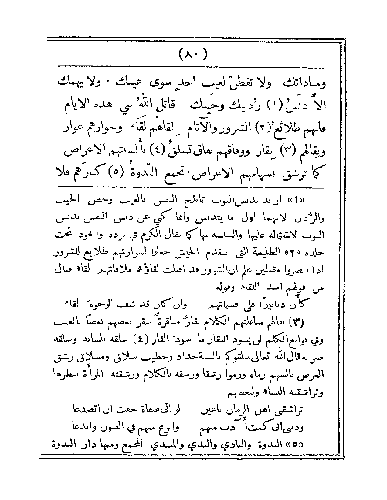 ومُناداتك. ولا تفطُنْ لعيبِ أحدٍ سوى عيبك. ولا يهمكَ إلا دنسُ رُدْنَيكَ وجيبك. قاتلَ اللهُ بني هذهِ الأيام. فإنهمْ طلائعُ الشرورِ والآثام. لِقاهمْ لقاءٌ وحوارُهم غِوار. ونِقالُهم نِقارْ. ووِفُاقهم نِفاقٌ تسلِق بألسنتِهم الأعراض. كما ترشقُ بسهامهِم الأغراض. تجمَعُ النّدوَةَ كِبارَهم فلا