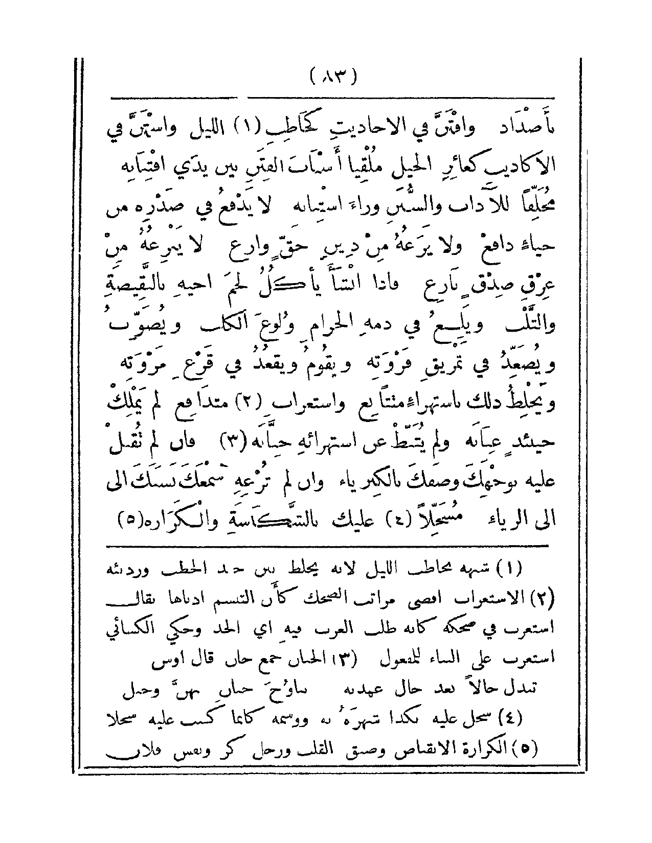 بأضداد. وافتنَّ في الأحاديثِ كحاطبِ الليلْ. واستنَّ في الأكاذيبِ كعائرِ الخيلْ ملقياً أسبابَ الفتنِ بين يديِ افتنانه. مخلّفاً للآدابِ والسننِ وراءَ استنانهِ. لا يدفعُ في صدرِه من حياءٍ دافعْ. ولا يزَعهُ من دينِ حق وازِع. ولا ينزعُه من عرقِ صدقٍ نازع. فإذا أنشأ يأكلُ لحمَ أخيهِ بالنقيصةِ والثّلبِ. ويلغُ في دمهِ الحرامِ وُلوغَ الكلب. ويصوَّبُ ويصعّدُ في تمزيقِ فروتهِ. ويقومُ ويقعدُ في قرعِ مروته. ويخلطُ ذلكَ باستهزاءٍ متتابع. واستغرابٍ متدافع. لم يملكْ حينئذٍ عنانهْ. ولم يُثبطْ عنِ استهزائهِ جنّانه فإن لم تُقبل عليهِ بوجهكَ وصفكَ بالكبرياءْ. وإن لم ترعهِ سمعكَ نسبكَ إلى الرّياءْ مسجّلاً عليكَ بالشكاسةِ والكزازةْ.