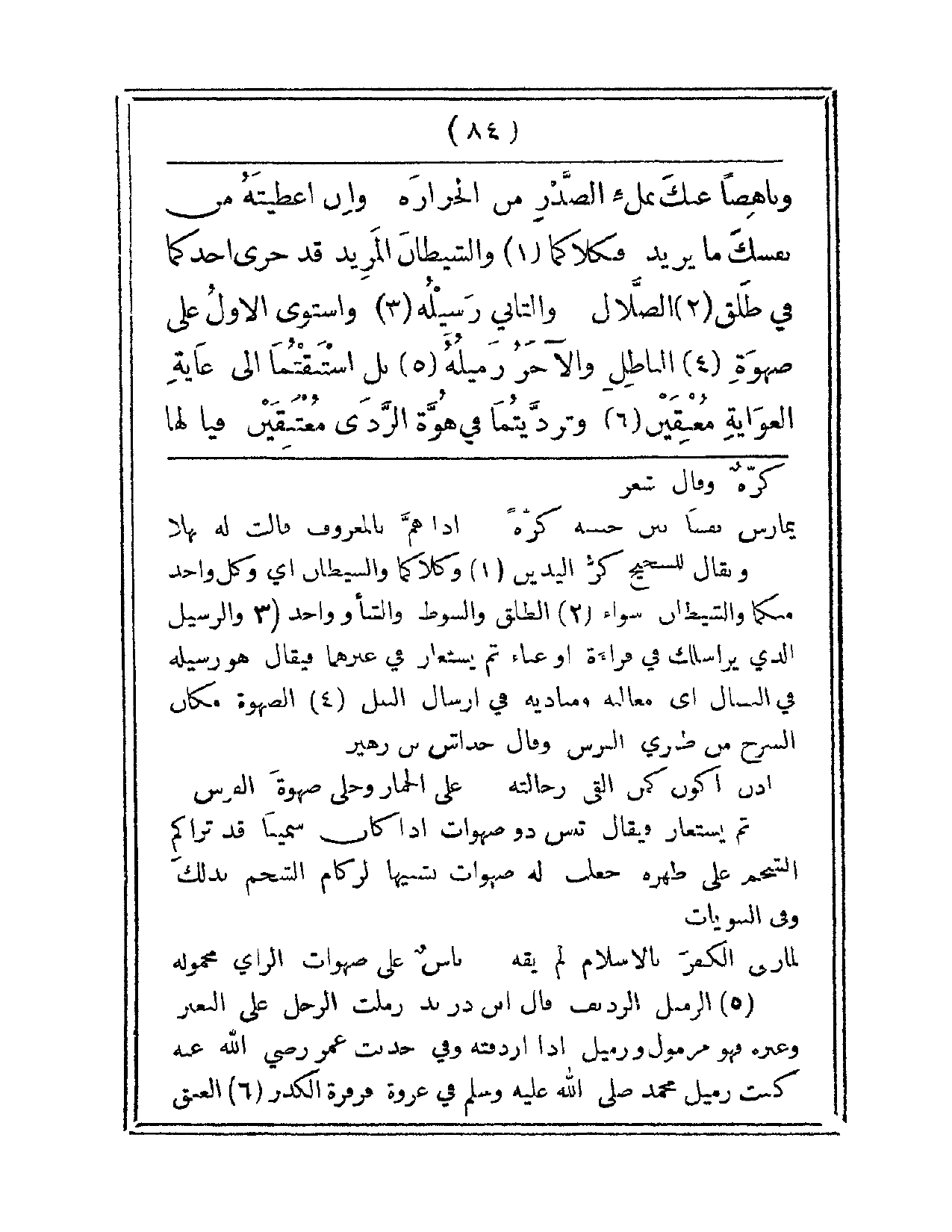 وناهضاً عنكَ بملءْ الصدرِ منَ الحزازة. وإن أعطيتهُ من نفسِكَ ما يريد فكلاكما والشيطانُ المريد. قد جرى أحدُكما في طلقِ الضلالِ والثاني رسيلُه. واستوى الأولُ على صهوةِ الباطلِ والآخرُ زميلهُ. بل استبقتُما إلى غايةِ الغوايةِ مُعنِقينْ. وتردَّيتما في هُوَّةِ الرَّدى معتنقِينْ. فيالها