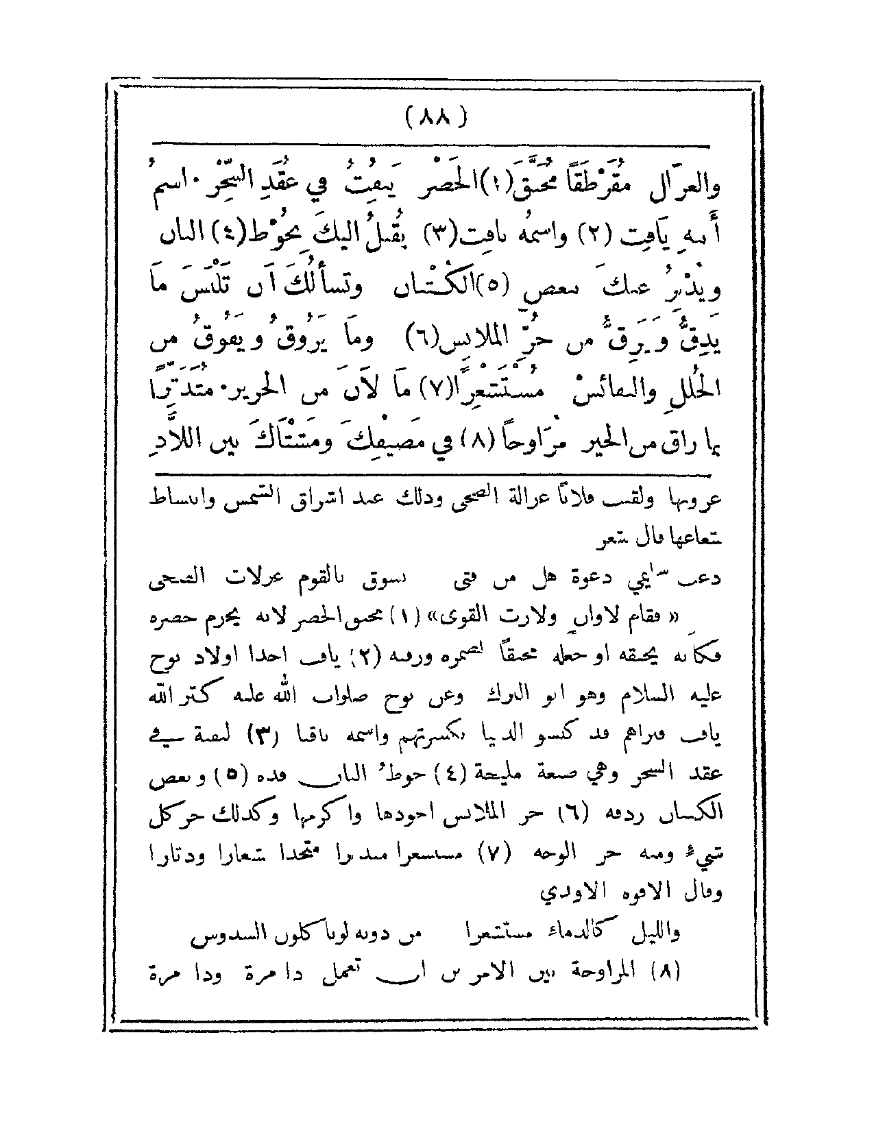والغزال. مُقرطَعاً مخَنق الْخَصْر ينفثُ في عُقدِ السّحْر. اسمُ أبيهِ يافث. واسمهُ نافِث يقبلُ إليكَ بخُوْطِ البانْ. ويدبرُ عنكَ ببعضِ الكثبان. وتسألُكَ أن تلبسَ ما يدِق ويرِق من حُرِّ الملابس. وما يروقُ ويفوقُ منَ الحللِ والنّفائس مُستشعراً ما لانَ منَ الحريرْ. مُتدثِّراً بما راقَ منَ الخير. مُروِاحاً في مصيفكَ ومَشتاكَ بينَ اللاذِ