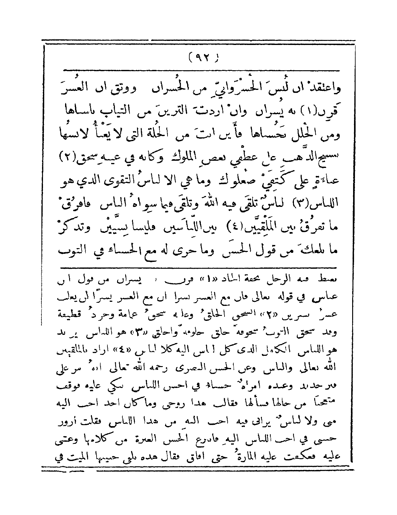 واعتقدَ أنَّ لبسَ الخُسرَوانِّي منَ الخُسرانِ. ووثقَ أنَّ العُسرَ قُرِنَ بهِ يُسران وإن أردتَ التزينَ منَ الثيابِ بأسناها. ومنَ الحُللِ بحُسناها. فأين أنتَ منَ الحلّةِ التي لا يعبأ لابسُها بنسيجِ الذَّهبِ على عطفي بعضِ الملوكْ. وكأنهُ في عينهِ سحقُ عباءَةٍ على كتفيْ صُعلوكْ وما هي إلا لباسُ التّقوى الذي هوَ اللَّباسْ لباسٌ تلقَى فيهِ اللهَ وتلقى فيما سواهُ الناسُ فافُرقْ ما تفرُقُ بينَ الملقييّنْ بينَ اللِّباسَين فليَسا بسِّييْن وتذكّرْ ما بلغَكَ من قولِ الحسَنْ. وما جرى لهُ مع الحسناءِ في الثوبِ