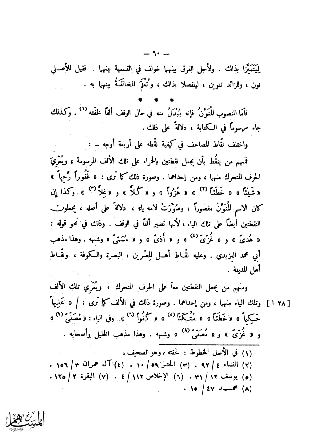 فَأَما مَا جَاءَت الْهمزَة المسهلة فِيهِ من هَذَا الضَّرْب مرسومة يَاء بِالسَّوَادِ كَقَوْلِه أئنكم فِي الانعام وَفِي النَّمْل وَفِي الثَّانِي من العنكبوت وَفِي فصلت وأثنا فِي النَّمْل والصفت وأئن لنا فِي الشُّعَرَاء وأئذا فِي الْوَاقِعَة وأئن ذكرْتُمْ فِي يس وأئفكا فِي وَالصَّافَّات فَإِن الالف المصورة فِي ذَلِك هِيَ همزَة الِاسْتِفْهَام لَا غير لَان الْهمزَة المسهلة قد صورت بعْدهَا على نَحْو حركتها اعلاما بتسهيلها وان لم تكن يَاء خَالِصَة فِي الْحَقِيقَة فَإِنَّهَا مقربة مِنْهَا والمقرب من الشَّيْء قد يحكم لَهُ بِحكم الشَّيْء وان لم يكن كَهُوَ فِي الْحَقِيقَة الا ترى ان الْهمزَة الْمَفْتُوحَة لَا تجْعَل بَين بَين قبل ضمة اَوْ كسرة بل تبدل مَعَ الضمة واوا وَمَعَ الكسرة يَاء وَذَلِكَ انها لَو جعلت بَين بَين لَصَارَتْ بَين الْهمزَة والالف والالف لَا يكون مَا قبلهَا مضموما وَلَا مكسورا كَذَلِك لَا يكون قبل مَا قرب بالتسهيل مِنْهَا فَكَمَا حكم هَا هُنَا للمقرب