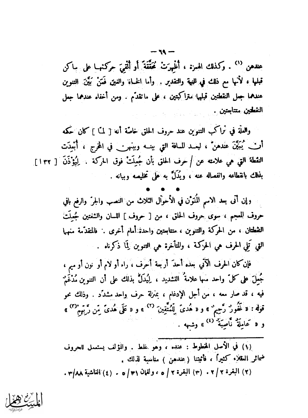 فَأَما نقط ذَلِك على مَذْهَب من حقق الهمزتين فَهُوَ ان تجْعَل الْهمزَة الاولى نقطة بالصفراء وحركتها نقطة بالحمراء تحتهَا بعد الالف الَّتِي هِيَ آخر الْكَلِمَة الاولى وَتجْعَل الْهمزَة الثَّانِيَة نقطة بالصفراء وحركتها تحتهَا فِي الالف الَّتِي هِيَ اول الْكَلِمَة الثَّانِيَة وَصُورَة ذَلِك كَمَا ترى هَؤُلَاءِ ان كُنْتُم وَمن النِّسَاء الا وَشبهه