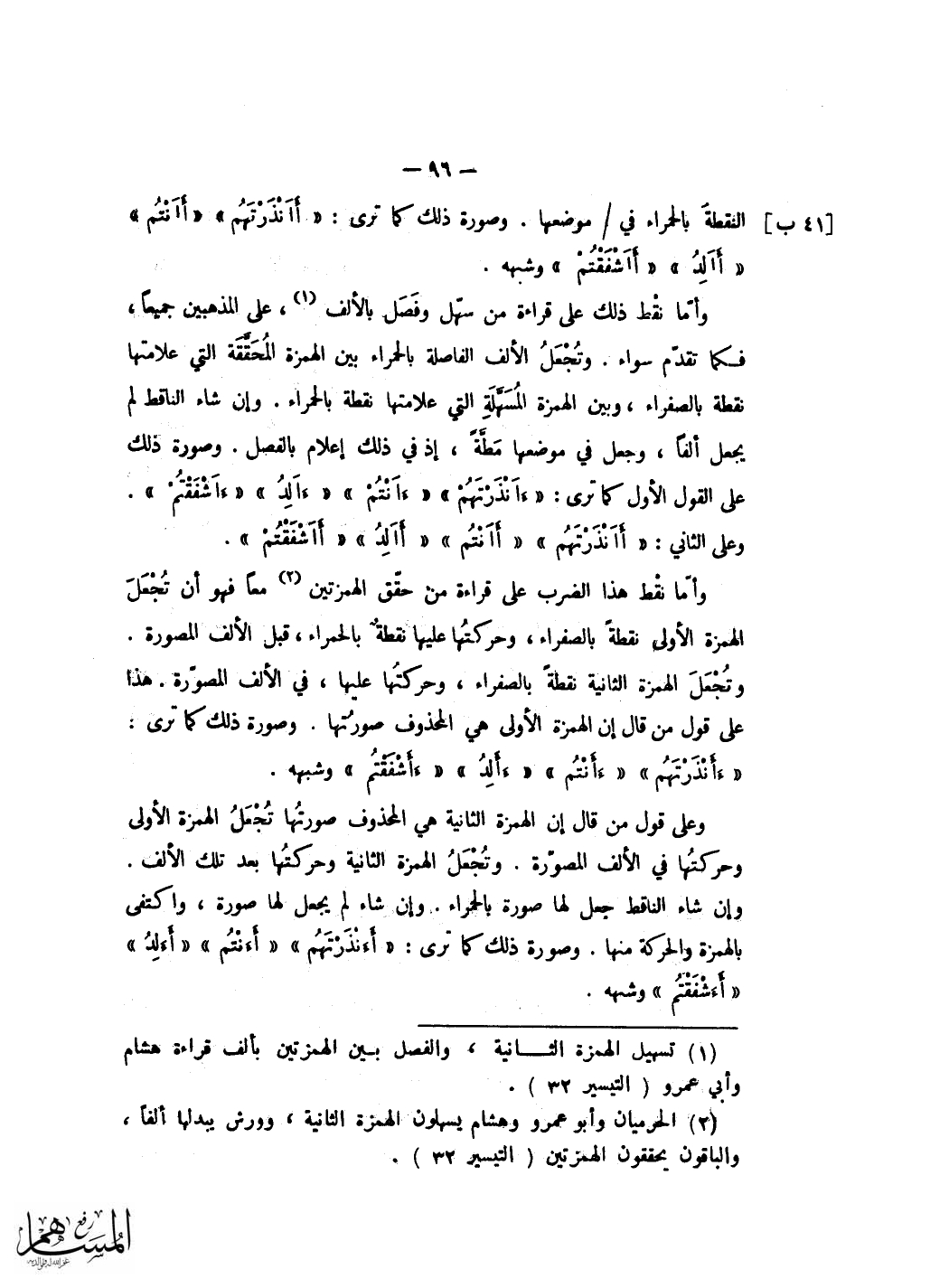 فَإِذا نقط هَذَا الضَّرْب جعلت الْهمزَة نقطة بالصفراء وحركتها نقطة بالحمراء امامها قبل الْوَاو فِي السطر وَلم تصور الْهمزَة فِي ذَلِك واوا كَرَاهَة للْجمع بَين صُورَتَيْنِ متفقتين