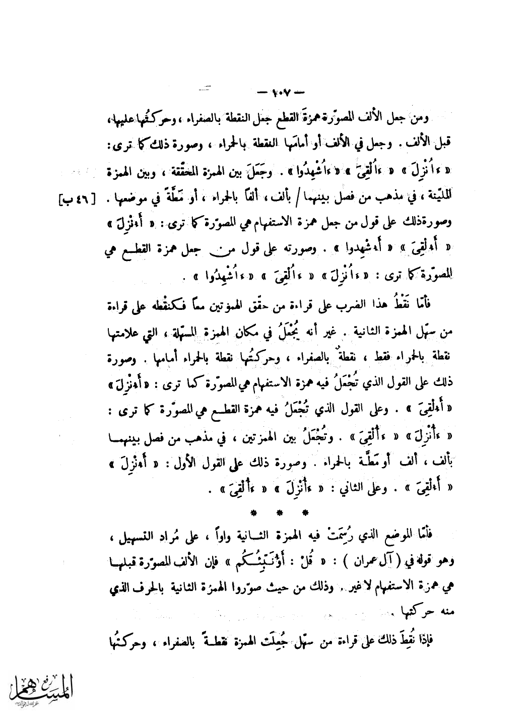 والهمزة قد تصور على المذهبين من التَّحْقِيق والتسهيل دلَالَة على فشوهما واستعمالهما فِيهَا الا ان اكثر الرَّسْم ورد على التَّخْفِيف وَالسَّبَب فِي ذَلِك كَونه لُغَة الَّذين ولوا نسخ الْمَصَاحِف زمن عُثْمَان رَحمَه الله وهم قُرَيْش وعَلى لغتهم اقرت الْكِتَابَة حِين وَقع الْخلاف بَينهم وَبَين الانصار فِيهَا على مَا ورد فِي الْخَبَر الثَّابِت الْمَذْكُور فِي كتاب المرسوم فَلذَلِك ورد تَصْوِير اكثر الْهَمْز على التسهيل اذ هُوَ المستقر فِي طباعهم والجاري على السنتهم واما الْقُرْآن