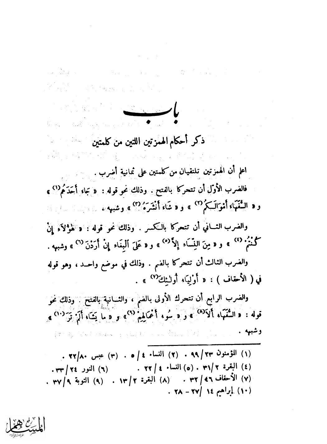 احداهن ان ثعلبا وموافقيه قد اجْمَعُوا مَعنا على ان الْمَحْذُوف من الرَّسْم تَخْفِيفًا فِي نَحْو قَوْله يرب وَيقوم وينوح وَهَذَا وَهَذَانِ وَهَذِه وهتين واهكذا وَشبهه من المنادى والتنبيه من الاسماء هُوَ الالف الساكنة لَا غير لعدم سواهَا فِي ذَلِك فَكَمَا حذفت هَا هُنَا بِإِجْمَاع كَذَلِك يجب ان تحذف هُنَاكَ لَا سِيمَا وَقد دخلت فِيهِ خَاصَّة على مَا هُوَ مثلهَا فِي الصُّورَة وَهُوَ الْهمزَة