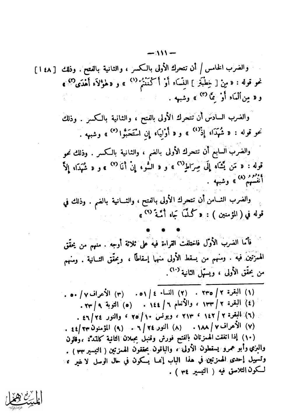 فَإِذا نقط هَذَا الضَّرْب على مَا ذَهَبْنَا اليه واوضحنا صِحَّته جعلت الْهمزَة نقطة بالصفراء فِي الالف المصورة لانها صورتهَا وَجعلت حركتها نقطة بالحمراء من فَوْقهَا ان كَانَت مَفْتُوحَة وَمن اسفلها ان كَانَت مَكْسُورَة وَمن امامها ان كَانَت مَضْمُومَة ورسمت الف بالحمراء بَين الْيَاء وَالْهَاء وَبَين تِلْكَ الالف وان شَاءَ الناقط لم يرسمها وَجعل مطة فِي موضعهَا على قِرَاءَة من جعل الْمُنْفَصِل كالمتصل فِي حُرُوف الْمَدّ مَعَ الْهمزَة