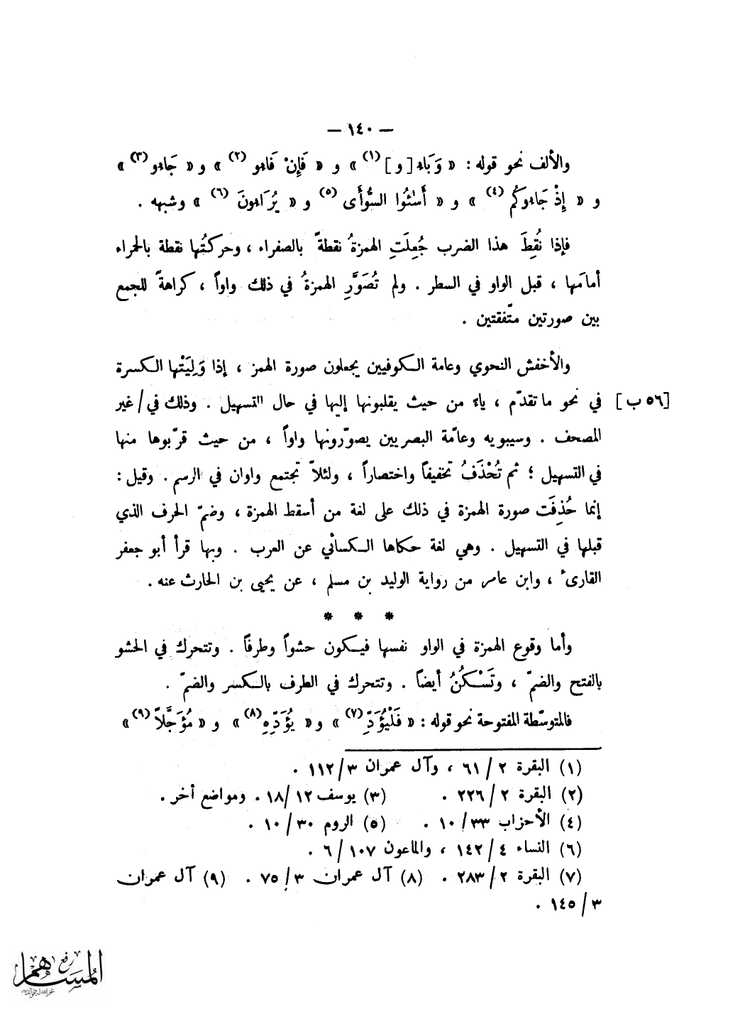 واتفقت الْمَصَاحِف على حذف الْوَاو الَّتِي هِيَ صُورَة الْهمزَة فِي قَوْله الرءيا ورءياك ورءياى فِي جَمِيع الْقُرْآن على مُرَاد تحقيقها دون تسهيلها وَذَلِكَ من حَيْثُ كَانَت الْهمزَة حرفا من سَائِر الْحُرُوف فاستغنت بذلك فِي حَال تحقيقها عَن الصُّورَة