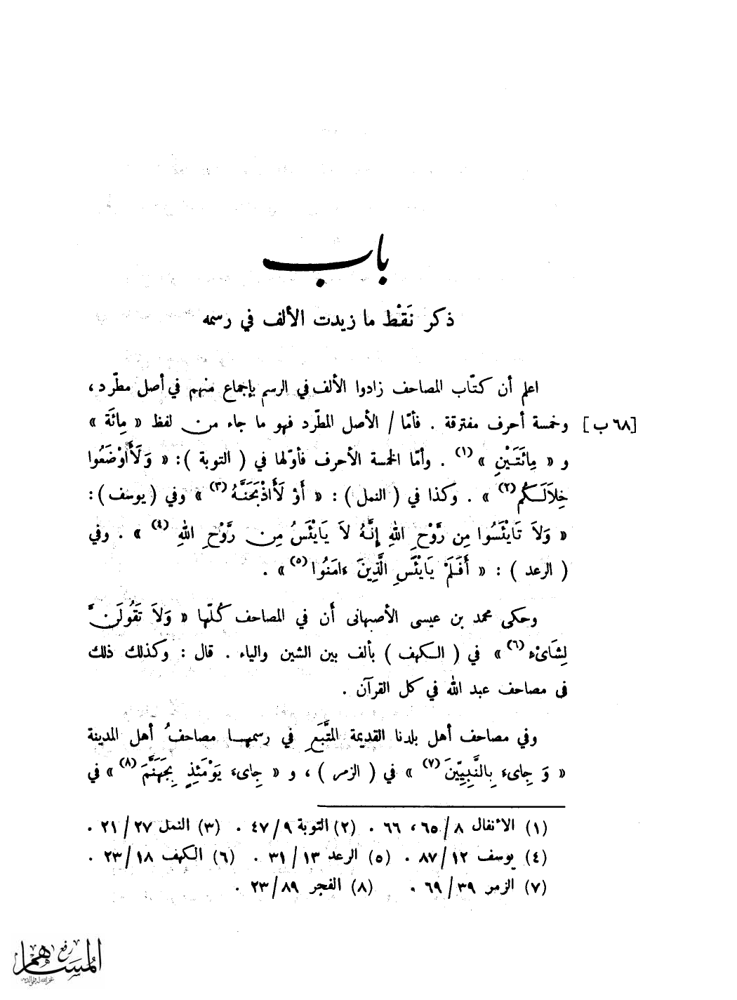 مصحف اهل الْكُوفَة فَإِنَّهُ اخلى هَذِه الميمات ثمَّ اتَّفقُوا كلهم على ان ينقطوها فِي نَحْو عَلَيْهِم الذلة واليهم اثْنَيْنِ وَمَا اشبه ذَلِك