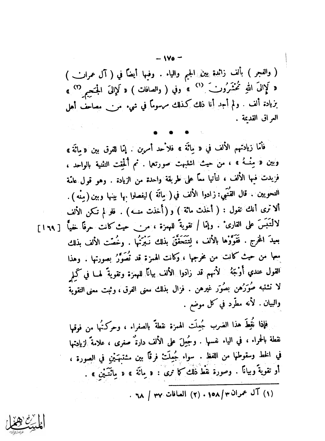 قَالَ وَلَا بُد من اثبات الالف فِي نَحْو دارست على قِرَاءَة من اثبتها بلون نقطه