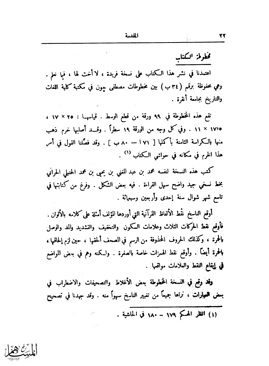 بالمصحف أَسمَاء الالوان واسماء الْقُرَّاء ليعرف ذَلِك الَّذِي يقْرَأ فِيهِ ولتكن الأصباغ صوافي لامعات والاقلام بَين الشدَّة واللين قَالَ وَإِن شِئْت أَن تجْعَل النقط مدورا فَلَا بَأْس بذلك وَإِن جعلت بعضه مدورا وَبَعضه بشكل الشّعْر فَغير ضائر بعد ان تُعْطِي ذَوَات الِاخْتِلَاف حُقُوقهَا قَالَ وَكَانَ بعض الْكتاب لَا يُغير رسم الْمُصحف الاول واذا مر بِحرف يعلم ان النقط والشكل لَا يضبطه كتب مَا يُرِيد من الْقرَاءَات الْمُخْتَلفَة تَعْلِيقا بألوان مُخْتَلفَة وَهَذَا كُله مَوْجُود فِي الْمَصَاحِف