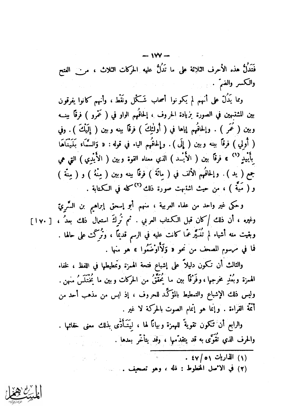 قَالَ ابْن اشته الالفات المقيدات مِمَّا يشْتَبه على الناقط وَذَلِكَ نَحْو قَوْله فَلَمَّا انبأهم سميت مُقَيّدَة لانها تنقط قُدَّام ووراء وَكَذَلِكَ السَّيِّئَات ورءا المجرمون وَهَذِه الالف انما تكون وسطا وآخرا وَلَا تكون فِي اول الْكَلِمَة وَمثله بدا وانشأكم ونئا ورئاء النَّاس وان لَا ملْجأ ومبوأ صدق ونبأ نوح وَاسَوْا الَّذِي والسواى والقرءان هَذِه الْكَلِمَات مقيدات