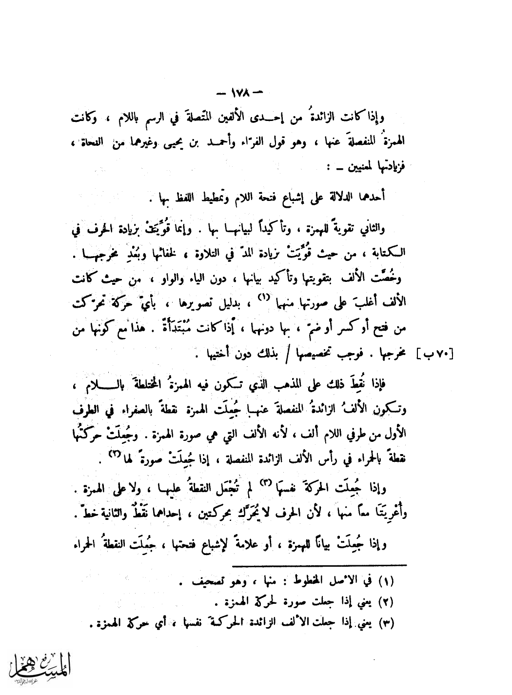 وَقَالَ ابْن مُجَاهِد اذا كَانَت الْهمزَة آخر كلمة والحرف مَقْصُورا مثل أنشأ جنَّات طرحت الْهمزَة فِي قفا الالف ونقطة اخرى فِي وَجه الالف للفتحة