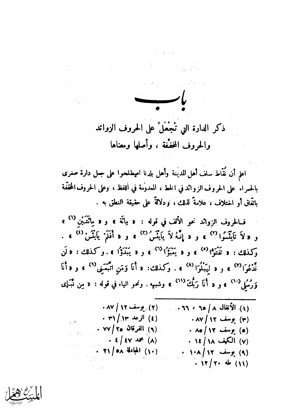 فَإِذا الْتَقت الهمزتان فِي كلمة اَوْ كَلِمَتَيْنِ نقطوهما مَعًا وَجعلُوا الاولى ان كَانَت للاستفهام فِي قفا الالف عَن يَمِينهَا كَمَا يجْعَلُونَ الْمَقْصُورَة سَوَاء وَجعلُوا الثَّانِيَة ان كَانَت مَفْتُوحَة فِي جبهة الالف عَن يسارها نَحْو ءأنذرتهم وءأنت قلت ءأمنتم ءألهتنا خير وَشبهه وان كَانَت الثَّانِيَة مَكْسُورَة جعلوها تَحت الالف نَحْو ءاله مَعَ الله إِذا متْنا ءانك لانت وَشبهه وان كَانَت الثَّانِيَة مَضْمُومَة جعلوها فِي ركبة الالف نَحْو ءألقي ءأنزل