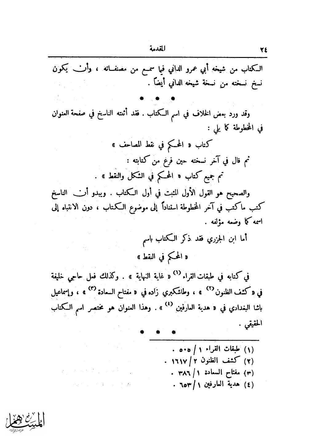 الى فهم الْقَارئ من النقط بلون وَاحِد بقلم مدور قَالَ وَفِي النقط علم كَبِير وَاخْتِلَاف بَين اهله وَلَا يقدر اُحْدُ على الْقِرَاءَة فِي مصحف منقوط إِذا لم يكن عِنْده علم بالنقط بل لَا ينْتَفع بِهِ إِن لم يُعلمهُ