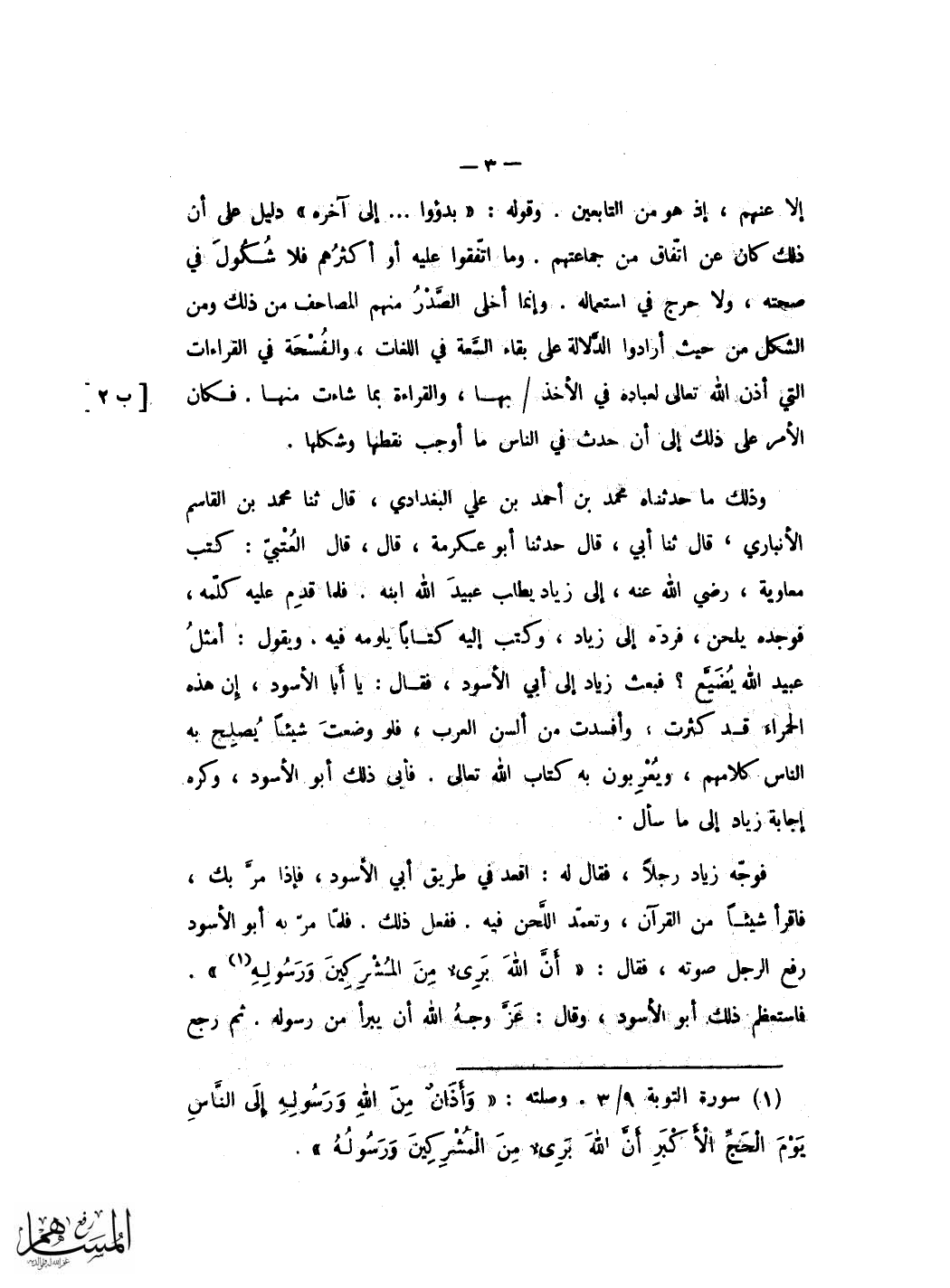 فَإِن قَالَ قَائِل لم جعلتم عَلامَة الْحَرَكَة المشبعة فِي هَذَا الضَّرْب الْفَا وياء وواوا وَقد انكرتم ذَلِك قبل فِي سَائِر الحركات ودللتم على صِحَة ذَلِك بالْخبر الَّذِي رويتموه عَن ابي الاسود مبتدىء النقط قيل لَهُ جعلنَا ذَلِك علامتها فِيهِ ليمتاز الِاخْتِلَاف ويرتفع الْإِشْكَال فِي معرفَة الْحَرَكَة المشبعة وَغير المشبعة أَلا ترى أَنا لم نستعمل ذَلِك فِيمَا اتّفق على اشباع الْحَرَكَة فِيهِ إِذْ لم يحْتَج الى تَمْيِيز وَلَا فرقان هَذَا مَعَ اقتدائنا فِي ذَلِك بِمن سنة من عُلَمَاء اللُّغَة ومتقدمي النُّحَاة وَهُوَ الْخَلِيل بن احْمَد رَحمَه الله وَعَامة اصحابه إِذْ عدمنا الرِّوَايَة فِيهِ عَمَّن تقدمه مِمَّن ابْتَدَأَ بنقط الْمَصَاحِف من التَّابِعين وَغَيرهم