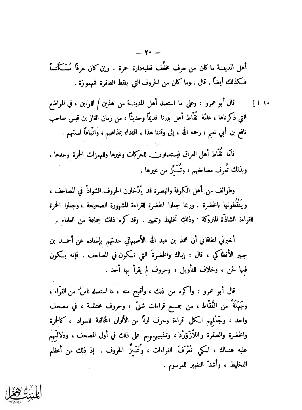 قَالَ وَذكر ابو عبد الرحمن ان اهل الْكُوفَة وَبَعض النقاط ينقطون الْمَنْصُوب إِذا استقبلته الْحُرُوف الحلقية فَإِذا استقبلته غَيرهَا لم ينقطوا لدلَالَة الالف على النصب قَالَ وَكَانَ اليزيدي يذهب الى أصل هَذَا القَوْل وَخَالفهُ من قَالَ بقوله من سَائِر النقطاط فنقطوا الْمنون فِي حالاته الثَّلَاث الرّفْع وَالنّصب والجر استقبلته حُرُوف الْحلق أَو لم تستقبله وَهُوَ الْمَعْمُول بِهِ حَتَّى الان عِنْد النقاط وَكَذَلِكَ هُوَ فِي الْمَصَاحِف الْعتْق وَهُوَ أوثق وَأحسن