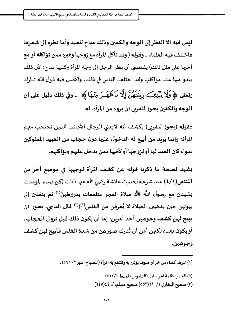يشهد لصحة ما ذكرنا قوله عن كشف المرأة لوجهها في موضع آخر من المنتقى (١/ ٤) عند شرحه لحديث عائشة رضي الله عنها قالت (كن نساء المؤمنات يشهدن مع رسول اللَّه - صلى الله عليه وسلم - صلاة الفجر متلفعات بمروطهنّ (¬١) ثم ينقلبن إلى بيوتهن حين يقضين الصلاة لا يُعرفن من الغلس (¬٢)) (¬٣) قال الباجي: يجوز أن يبيح لهن كشف وجوههن أحد أمرين: إما أن يكون ذلك قبل نزول الحجاب، أو يكون بعده لكنهن أمِنَّ أن تُدرك صورهن من شدة الغلس فأبيح لهن كشف وجوههن.