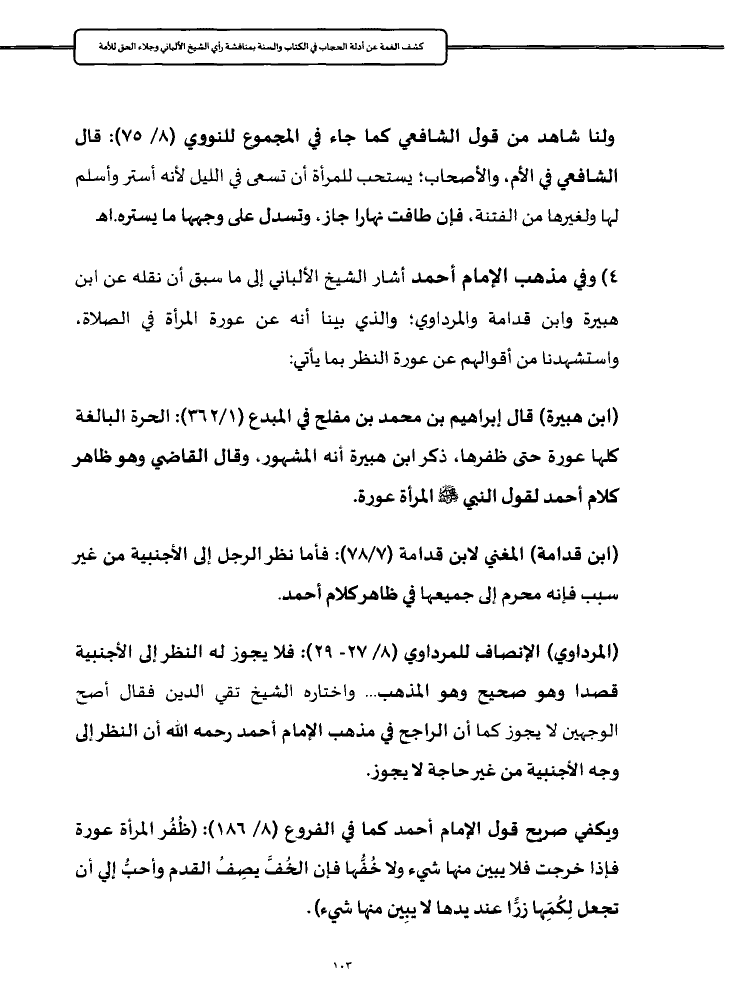 ٤) وفي مذهب الإمام أحمد أشار الشيخ الألباني إلى ما سبق أن نقله عن ابن هبيرة وابن قدامة والمرداوي؛ والذي بينا أنه عن عورة المرأة في الصلاة، واستشهدنا من أقوالهم عن عورة النظر بما يأتي: