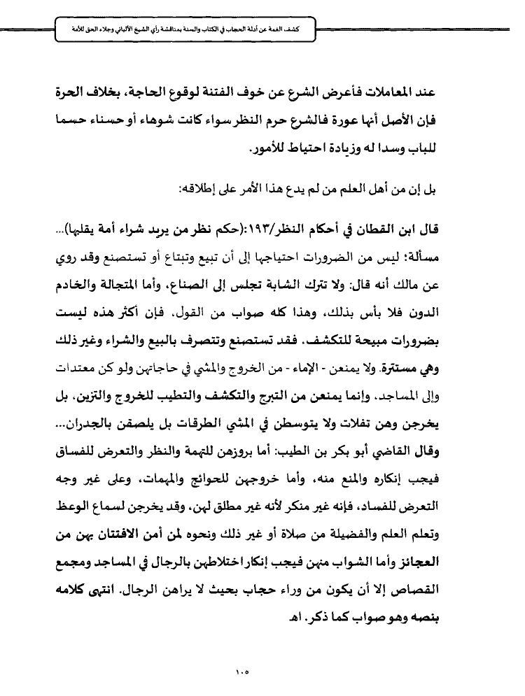 قال ابن القطان في أحكام النظر/١٩٣: (حكم نظر من يريد شراء أمة يقلبها) ... مسألة؛ ليس من الضرورات احتياجها إلى أن تبيع وتبتاع أو تستصنع وقد روي عن مالك أنه قال: ولا تترك الشابة تجلس إلى الصناع، وأما المتجالة والخادم الدون فلا بأس بذلك، وهذا كله صواب من القول، فإن أكثر هذه ليست بضرورات مبيحة للتكشف، فقد تستصنع وتتصرف بالبيع والشراء وغير ذلك وهي مستترة. ولا يمنعن - الإماء - من الخروج والمشي في حاجاتهن ولو كن معتدات وإلى المساجد، وإنما يمنعن من التبرج والتكشف والتطيب للخروج والتزين، بل يخرجن وهن تفلات ولا يتوسطن في المشي الطرقات بل يلصقن بالجدران ... وقال القاضي أبو بكر بن الطيب: أما بروزهن للتهمة والنظر والتعرض للفساق فيجب إنكاره والمنع منه، وأما خروجهن للحوائج والمهمات، وعلى غير وجه التعرض للفساد، فإنه غير منكر لأنه غير مطلق لهن، وقد يخرجن لسماع الوعظ وتعلم العلم والفضيلة من صلاة أو غير ذلك ونحوه لمن أمن الافتتان بهن من العجائز وأما الشواب منهن فيجب إنكار اختلاطهن بالرجال في المساجد ومجمع القصاص إلا أن يكون من وراء حجاب بحيث لا يراهن الرجال. انتهى كلامه بنصه وهو صواب كما ذكر. اهـ