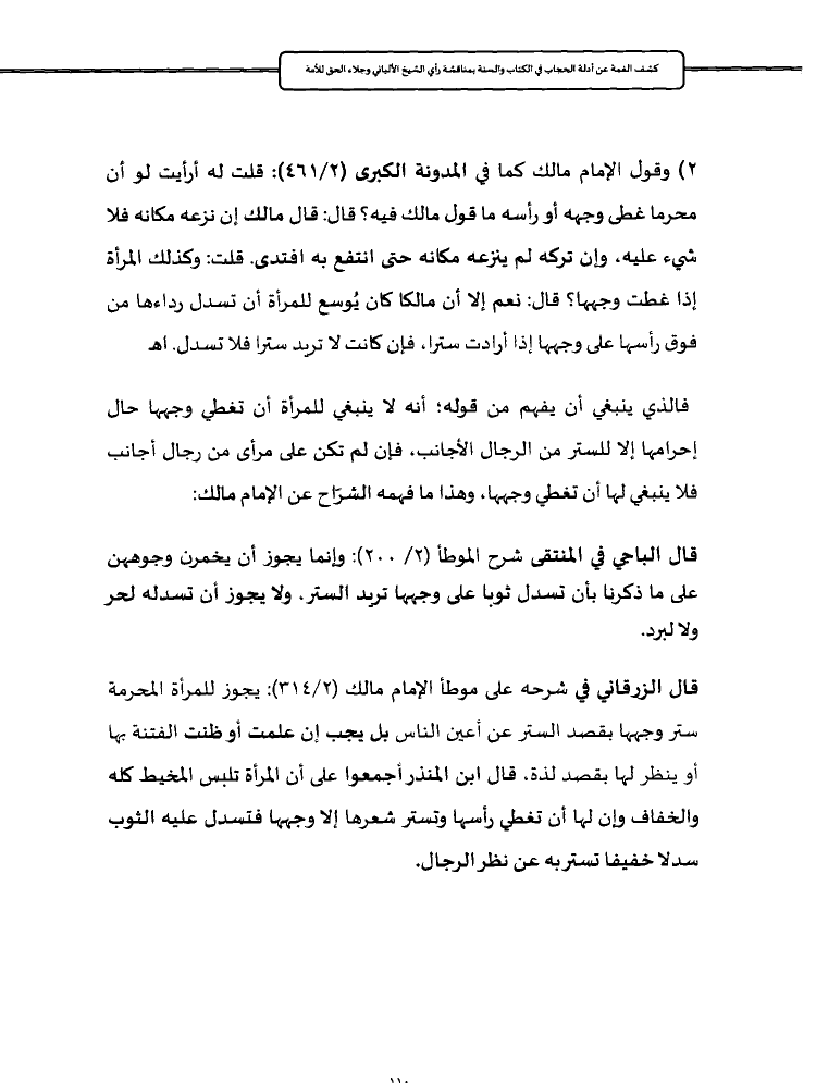٢) وقول الإمام مالك كما في المدونة الكبرى (٢/ ٤٦١): قلت له أرأيت لو أن محرما غطى وجهه أو رأسه ما قول مالك فيه؟ قال: قال مالك إن نزعه مكانه فلا شيء عليه، وإن تركه لم ينزعه مكانه حتى انتفع به افتدى. قلت: وكذلك المرأة إذا غطت وجهها؟ قال: نعم إلا أن مالكا كان يُوسع للمرأة أن تسدل رداءها من فوق رأسها على وجهها إذا أرادت سترا، فإن كانت لا تريد سترا فلا تسدل. اهـ