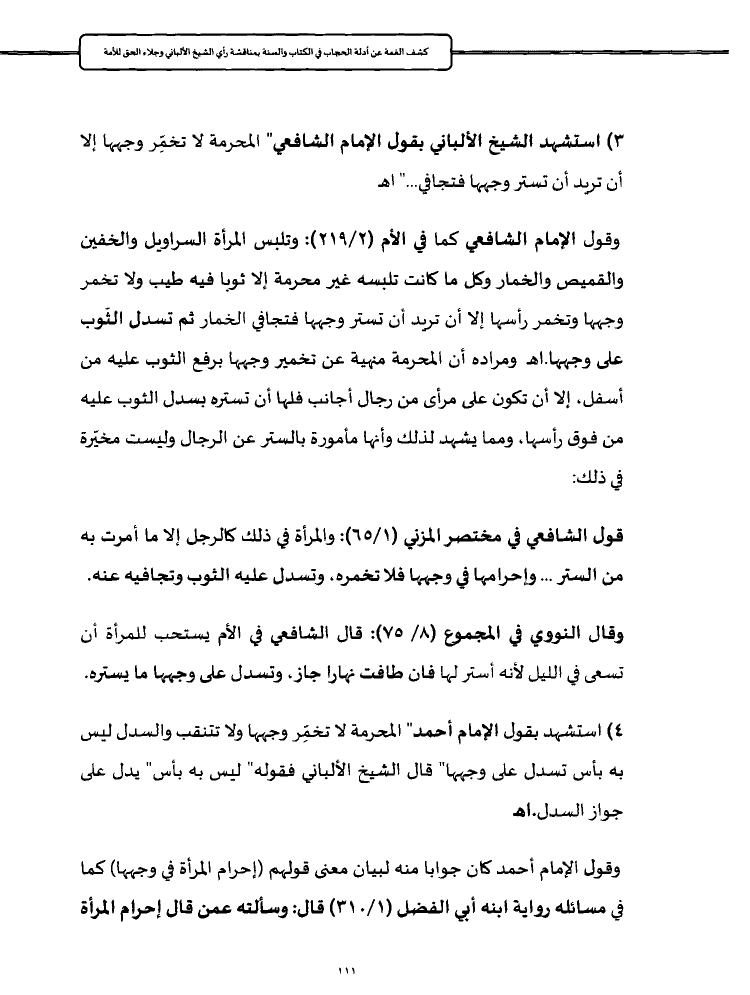 ٣) استشهد الشيخ الألباني بقول الإمام الشافعي" المحرمة لا تخمِّر وجهها إلا أن تريد أن تستر وجهها فتجافي ... " اهـ