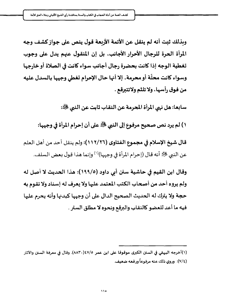 ١) لم يرد نص صحيح مرفوع إلى النبي - صلى الله عليه وسلم - على أن إحرام المرأة في وجهها: