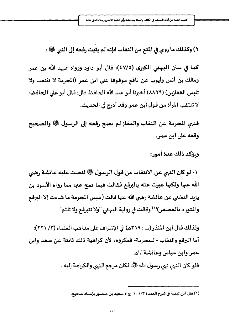 ٢) وكذلك ما روي في المنع من النقاب فإنه لم يثبت رفعه إلى النبي - صلى الله عليه وسلم -: