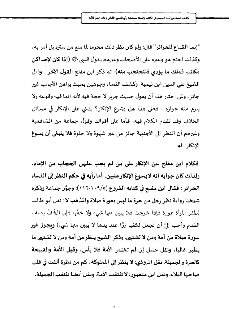 فكلام ابن مفلح عن الإنكار على من لم يجب عليهن الحجاب من الإماء، ولذلك كان جوابه أنه لايسوغ الإنكار عليهن، أما رأيه في حكم النظر إلى النساء الحرائر؛ فقال ابن مفلح في كتابه الفروع (٥/ ١٠٩ - ١١٢): وجوَّز جماعة وذكره شيخنا رواية نظر رجل من حرة ما ليس بعورة صلاة والمذْهب لا؛ نقل أبو طالب (ظفر المرأة عورة فإذا خرجت فلا يبين منها شيء ولا خفُّها فإن الخُفَّ يصف القدم وأحب إليَّ أن تجعل لكمِّها زرًّا عند يدها لا يبين منها شيء) ويجوز غير عورة صلاة من أمة ومن لا تشتهى. وذكر الشيخ ينظر من أمة ومن لا تشتهى ما يظهر غالبا، ونقل حنبل إن لم تختمر الأمة فلا بأس، وقيل الأمة والقبيحة كالحرة والجميلة. نقل المروذي: لا ينظر إلى المملوكة، كم من نظرةألقت في قلب صاحبها البلاء. ونقل ابن منصور: لا تنتقب الأمة. ونقل أيضا تنتقب الجميلة.
