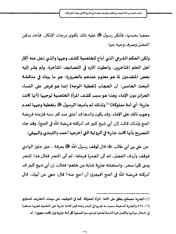 ولكن الحكم الشرعي الذي أباح للخثعمية كشف وجهها والذي ذهل عنه أكثر أهل العلم المتأخرين، وانطوت آثاره في التصانيف المتأخرة، ولم يشر إليه بعض المتقدمين لما هو معلوم عندهم بالضرورة؛ هو ما بيناه في مناقشة البحث الخامس؛ أن الحجاب (تغطية الوجه) إنما هو فرض على النساء الحرائر دون الإماء. وهذا هو سبب كشف المرأة الخثعمية لوجهها (أنها كانت جارية؛ أي أمة مملوكة) (¬١) ولذلك لم يأمرها الرسول - صلى الله عليه وسلم - بتغطية وجهها لعدم وجوب ذلك على الإماء، وقد يكون والدها قد أعتق عند كبر سنه فلزمته فريضة الحج ولذلك قالت (إن أبي شيخ كبير قد أدركته فريضة اللَّه في الحج). وقد جاء التصريح بأنها كانت جارية في الرواية التي أخرجها أحمد والترمذي والبيهقي: