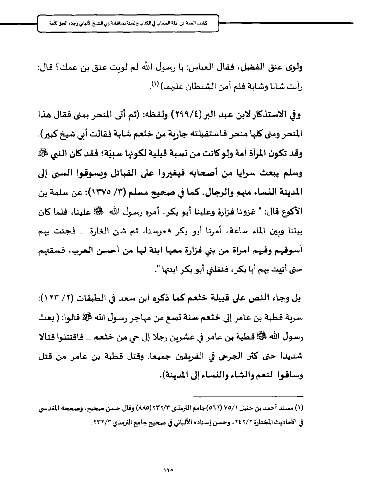وفي الاستذكار لابن عبد البر (٤/ ٢٩٩) ولفظه: (ثم أتى المنحر بمنى فقال هذا المنحر ومنى كلها منحر فاستقبلته جارية من خثعم شابة فقالت أبي شيخ كبير). وقد تكون المرأة أمة ولو كانت من نسبةقبلية لكونها سبيّة؛ فقد كان النبي - صلى الله عليه وسلم - وسلم يبعث سرايا من أصحابه فيغيروا على القبائل ويسوقوا السبي إلى المدينة النساء منهم والرجال، كما في صحيح مسلم (٣/ ١٣٧٥): عن سلمة بن الأكوع قال: " غزونا فزارة وعلينا أبو بكر، أمره رسول الله - صلى الله عليه وسلم - علينا، فلما كان بيننا وبين الماء ساعة، أمرنا أبو بكر فعرسنا، ثم شن الغارة ... فجئت بهم أسوقهم وفيهم امرأة من بني فزارة معها ابنة لها من أحسن العرب، فسقتهم حتى أتيت بهم أبا بكر، فنفلني أبو بكر ابنتها ".