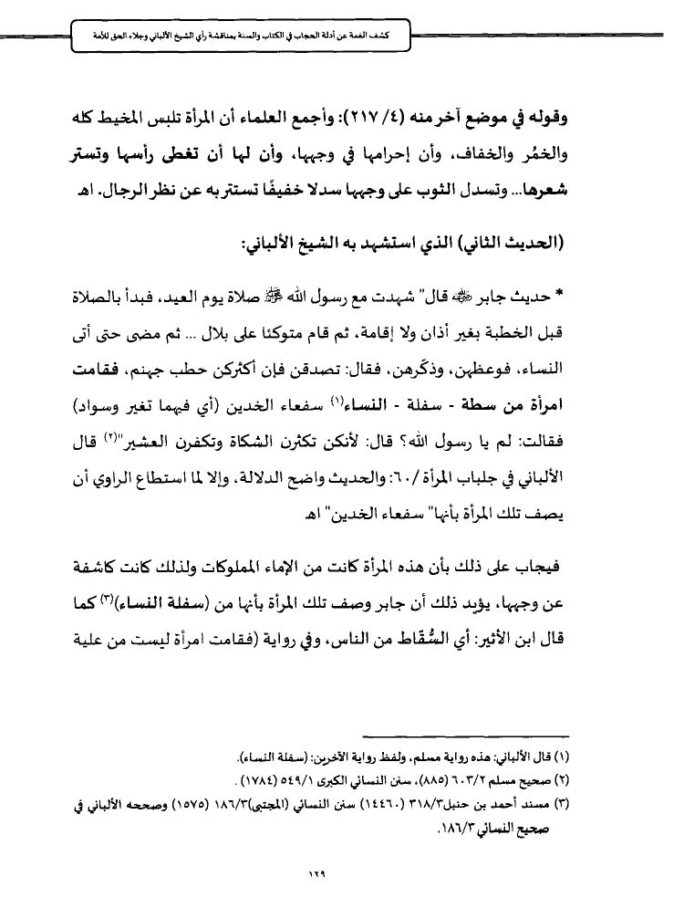* حديث جابر - رضي الله عنه - قال" شهدت مع رسول الله - صلى الله عليه وسلم - صلاة يوم العيد، فبدأ بالصلاة قبل الخطبة بغير أذان ولا إقامة، ثم قام متوكئا على بلال ... ثم مضى حتى أتى النساء، فوعظهن، وذكّرهن، فقال: تصدقن فإن أكثركن حطب جهنم، فقامت امرأة من سطة - سفلة - النساء (¬١) سفعاء الخدين (أي فيهما تغير وسواد) فقالت: لم يا رسول الله؟ قال: لأنكن تكثرن الشكاة وتكفرن العشير" (¬٢) قال الألباني في جلباب المرأة /٦٠: والحديث واضح الدلالة، وإلا لما استطاع الراوي أن يصف تلك المرأة بأنها" سفعاء الخدين" اهـ