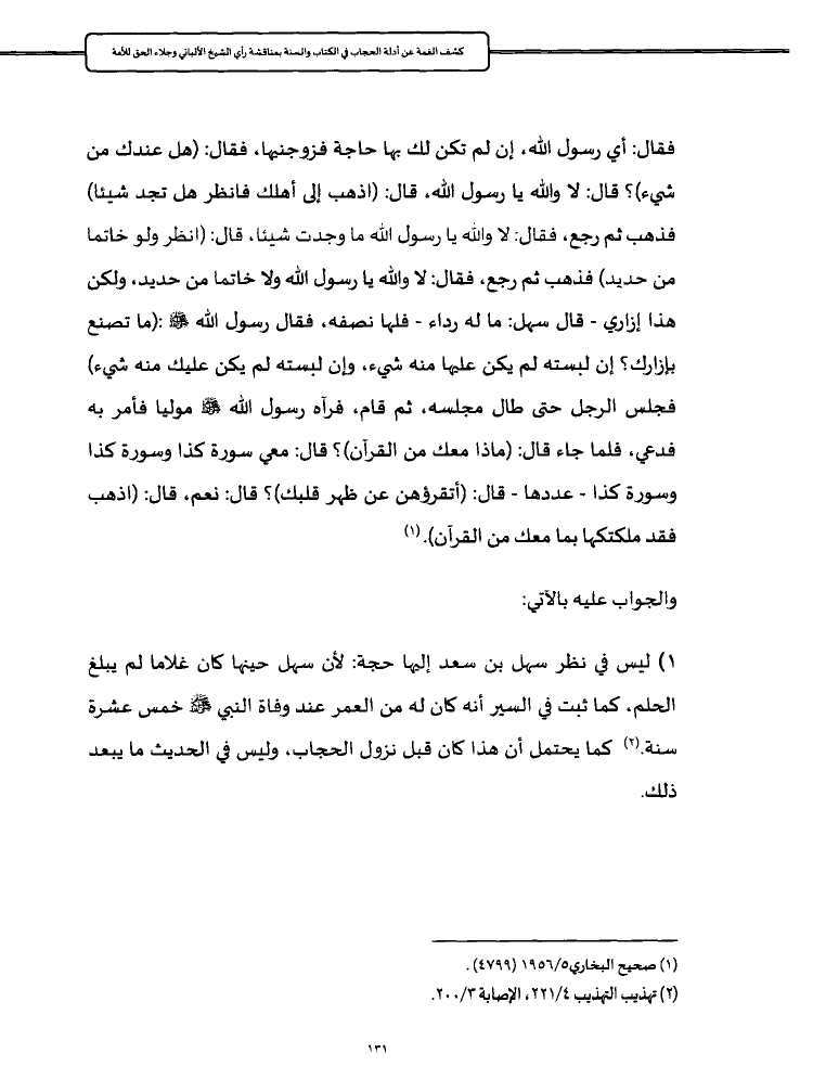 ١) ليس في نظر سهل بن سعد إليها حجة: لأن سهل حينها كان غلاما لم يبلغ الحلم، كما ثبت في السير أنه كان له من العمر عند وفاة النبي - صلى الله عليه وسلم - خمس عشرة سنة. (¬٢) كما يحتمل أن هذا كان قبل نزول الحجاب، وليس في الحديث ما يبعد ذلك.