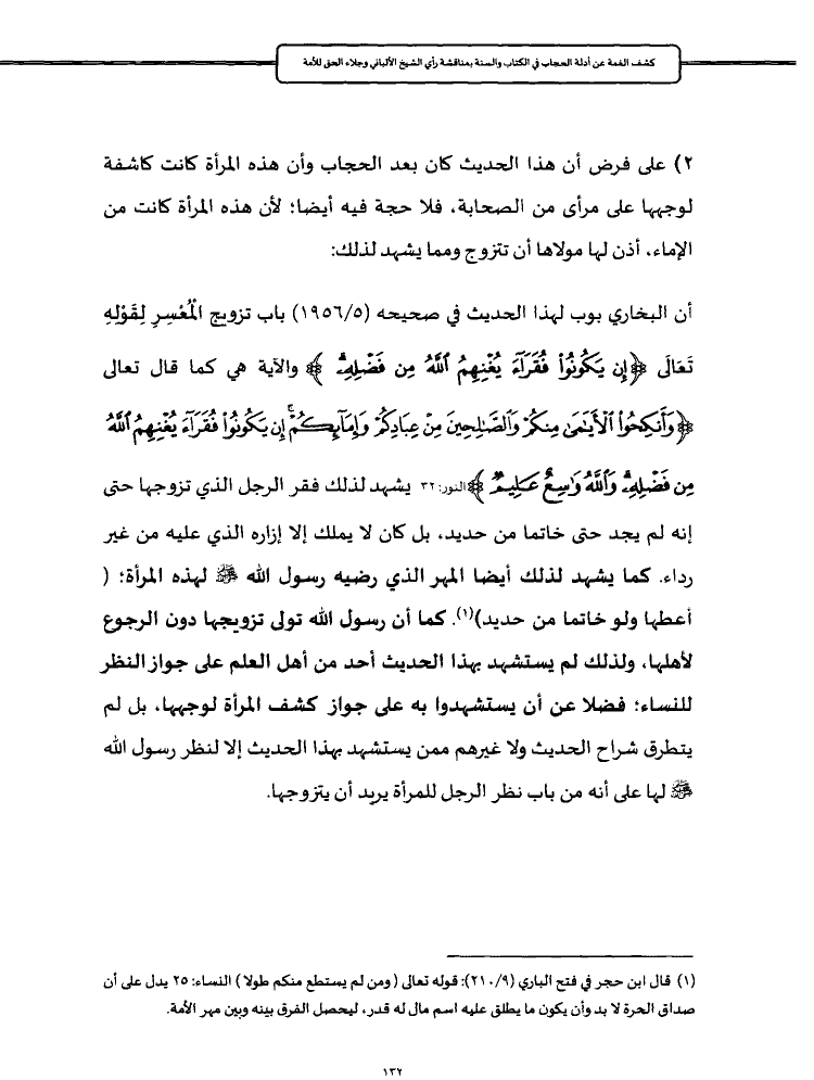 أن البخاري بوب لهذا الحديث في صحيحه (٥/ ١٩٥٦) باب تزويج الْمُعْسِرِ لِقَوْلِهِ تَعَالَى {إِنْ يَكُونُوا فُقَرَاءَ يُغْنِهِمُ اللَّهُ مِنْ فَضْلِهِ} والآية هي كما قال تعالى {وَأَنْكِحُوا الْأَيَامَى مِنْكُمْ وَالصَّالِحِينَ مِنْ عِبَادِكُمْ وَإِمَائِكُمْ إِنْ يَكُونُوا فُقَرَاءَ يُغْنِهِمُ اللَّهُ مِنْ فَضْلِهِ وَاللَّهُ وَاسِعٌ عَلِيمٌ} النور: ٣٢ يشهد لذلك فقر الرجل الذي تزوجها حتى إنه لم يجد حتى خاتما من حديد، بل كان لا يملك إلا إزاره الذي عليه من غير رداء. كما يشهد لذلك أيضا المهر الذي رضيه رسول الله - صلى الله عليه وسلم - لهذه المرأة؛ (أعطها ولو خاتما من حديد) (¬١). كما أن رسول الله تولى تزويجها دون الرجوع لأهلها، ولذلك لم يستشهد بهذا الحديث أحد من أهل العلم على جواز النظر للنساء؛ فضلا عن أن يستشهدوا به على جواز كشف المرأة لوجهها، بل لم يتطرق شراح الحديث ولا غيرهم ممن يستشهد بهذا الحديث إلا لنظر رسول الله - صلى الله عليه وسلم - لها على أنه من باب نظر الرجل للمرأة يريد أن يتزوجها.