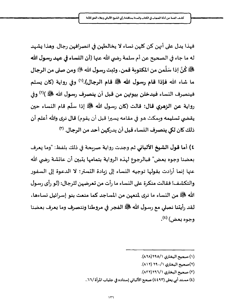 ٤) أما قول الشيخ الألباني ثم وجدت رواية صريحة في ذلك بلفظ: "وما يعرف بعضنا وجوه بعض" فبالرجوع لهذه الرواية بتمامها يتبين أن عائشة رضي الله عنها إنما أرادت بقولها توجيه النساء إلى زيادة التستر؛ لا الدعوة إلى السفور والتكشف! فقالت منكرة على النساء ما رأت من تعرضهن للرجال: (لو رأى رسول الله - صلى الله عليه وسلم - من النساء ما نرى لمنعهن من المساجد كما منعت بنو إسرائيل نساءها، لقد رأيتنا نصلي مع رسول الله - صلى الله عليه وسلم - الفجر في مروطنا وننصرف وما يعرف بعضنا وجوه بعض ((¬٤).